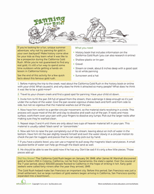 - Before making the trip to the creek, read about the California Gold Rush in the history book or online with your child. What caused it, and why does he think it attracted so many people? What does he think it was like to be a gold miner?
