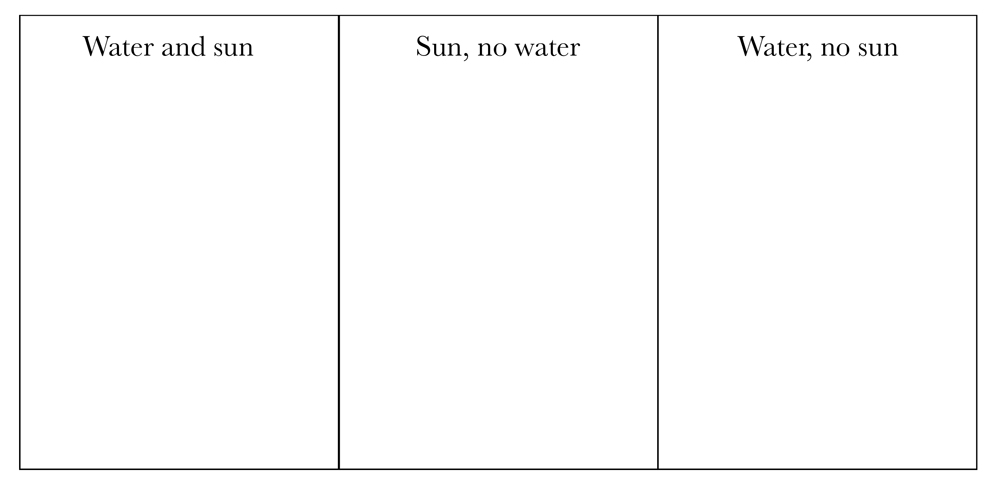 Place some potting soil in three cups and plant a generous amount of grass seed in each. Cover with a layer of soil. Water one cup and place it on a windowsill so that it will get plenty of sunlight. Use tape or a sticky note to label the cup: water and sun. Place a second cup on the windowsill but do not water it. Label this cup: sun, no water. Water the third cup but place it in an area where it will not get any sun or light. Label this cup: water, no sun. Note: Continue to water the two cups of grass labeled to receive water as needed throughout the experiment.