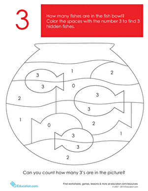 This math and coloring worksheet focuses on the number 3. Kids color all of the spaces with the number 3 to reveal a hidden fish picture.